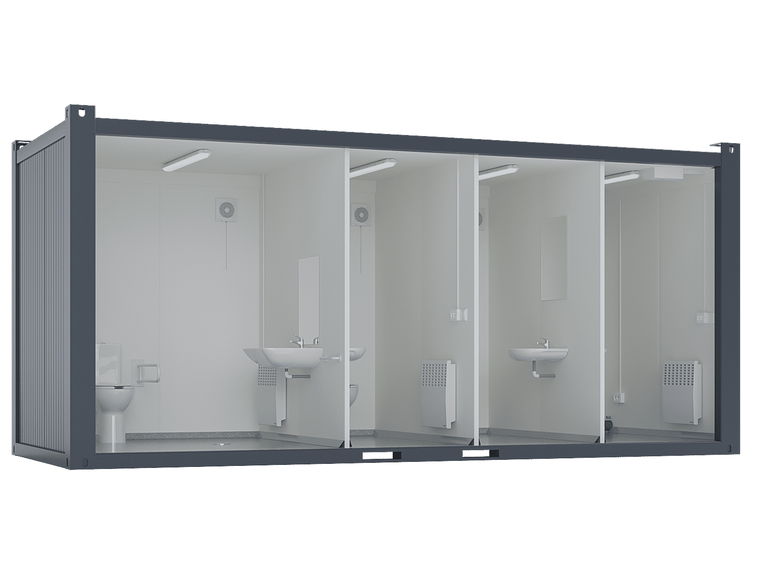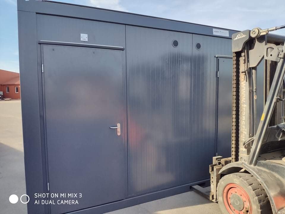 20′ Toilet Container, Strong thermal insulation and heating ensure comfortable use, even in winter. Separate exhaust air fans, fresh air valves, and LED lights in all spaces. In the barrier-free facility, there are lights with a motion detector and an exhaust fan, a toilet seat equipped with a riser, a separate floor drain, and a front door that can be opened with one hand.