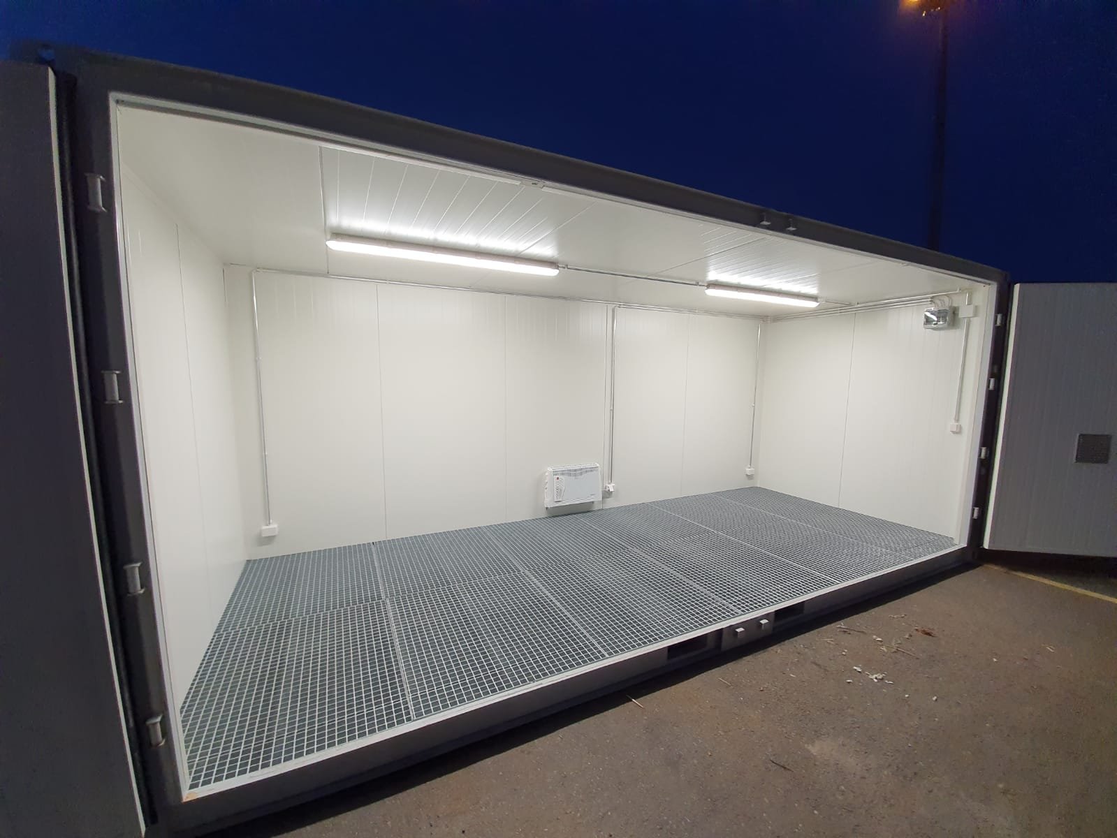 - PIR thermal insulation: The walls, roof, and doors are insulated with PIR sandwich elements. Interior surfaces are made of white sheet metal
