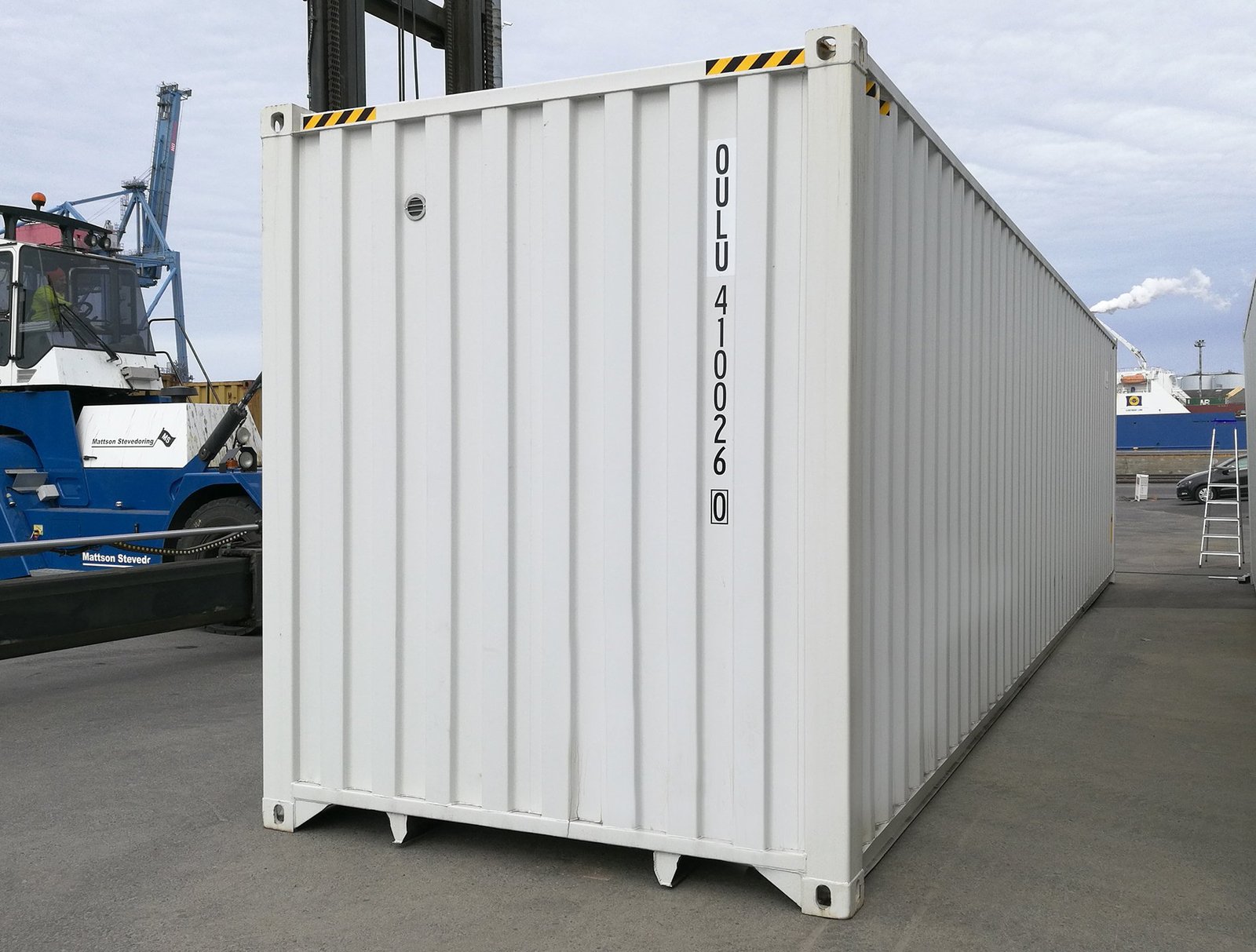 The 12m insulated container’s standard accessories include double doors at the end and disc valves for ventilation. We can also add other accessories, such as lighting, heating, and shelves. We recommend a radiator for winter storage, with the heating unit equipped with a thermostat, to maintain a steady temperature. Other common installations include inlets, improved ventilation, and footings for installed equipment. The container floor is insulated from below with 50 mm XPS, matching the floor’s load capacity with the container’s default value, i.e., more than 25,000 kg. This also makes loading with a pallet jack easy, as there is no extra threshold. The 40′ insulated container is built using an ISO standard-compliant marine container, so that it has a lifetime of several decades and can be transported by road like a standard container.