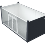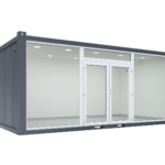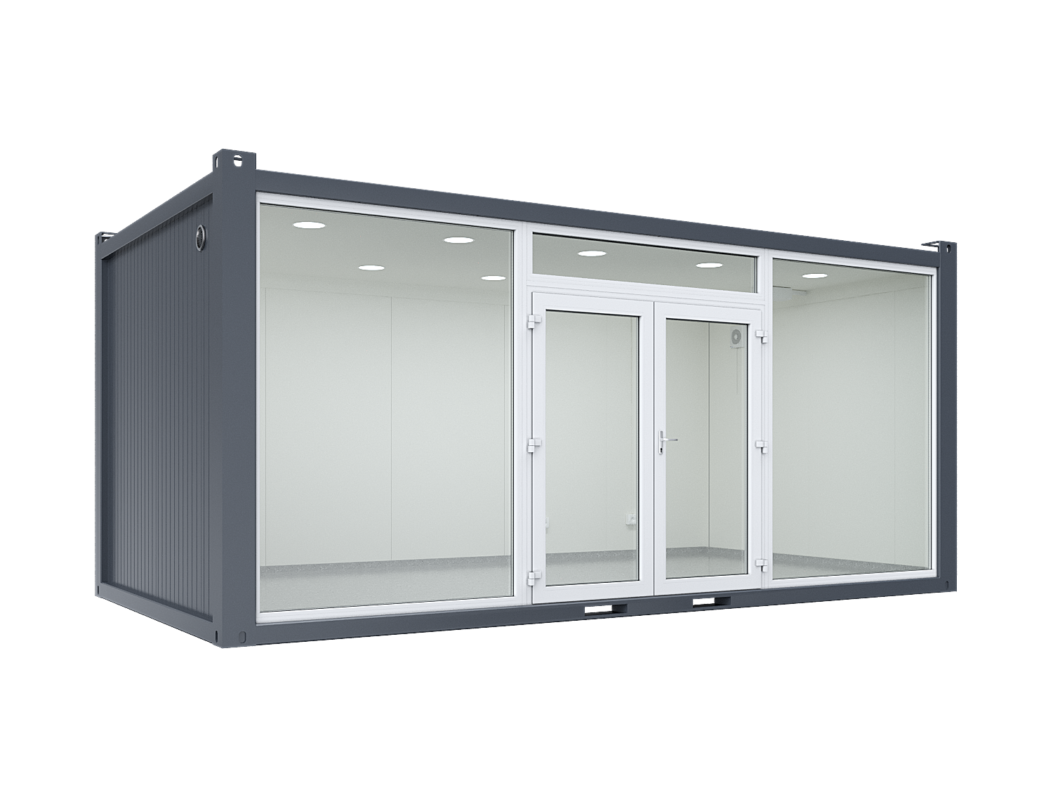 The most popular version of a 6m Glass Container with an inner width of 2990mm. At 18 m², the high-quality Premium class container offers an insulated, heated, and eye-catching multipurpose solution. The long side of the container is made of glass with glass double doors. The container comes with standard equipment of 10 recessed LED lights, a radiator, sockets, ventilation, and computer plugs. White inner surfaces and the internal height of 2520mm give the container a bright interior compared to low and dark containers. The walls are easy to keep clean as they are made of smooth sheet metal, and the grey vinyl floor is very durable. The container comes in an elegant dark grey (RAL 7024) or light grey (RAL 7035), which is a great fit with a range of situations and events. Office containers can be linked to each other, with the power supplied by a 5-pin, 32A socket, which can also be converted to 16A with an adapter.