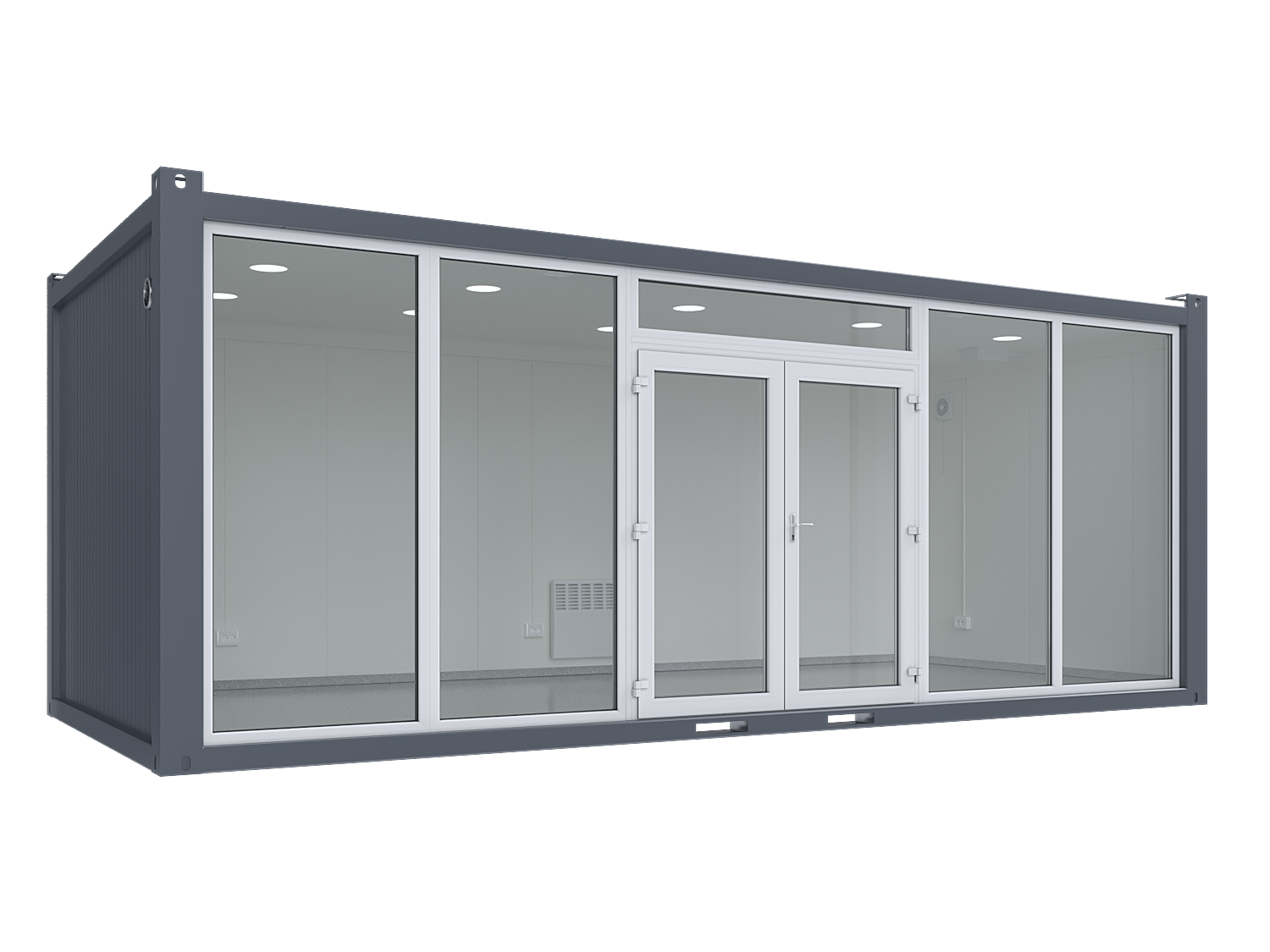 The largest glass container available in the standard collection. At 20 m², the high-quality Premium class container offers an insulated, heated, and eye-catching multipurpose solution. The long side of the container is made of glass with glass double doors. The container comes with standard equipment of 10 recessed LED lights, a radiator, sockets, ventilation, and computer plugs. White inner surfaces and the internal height of 2520mm give the container a bright interior compared to low and dark containers. The walls are easy to keep clean as they are made of smooth sheet metal, and the grey vinyl floor is very durable. The container comes in an elegant dark grey (RAL 7024) or light grey (RAL 7035), which is a great fit with a range of situations and events. Office containers can be linked to each other, with the power supplied by a 5-pin, 32A socket, which can also be converted to 16A with an adapter.