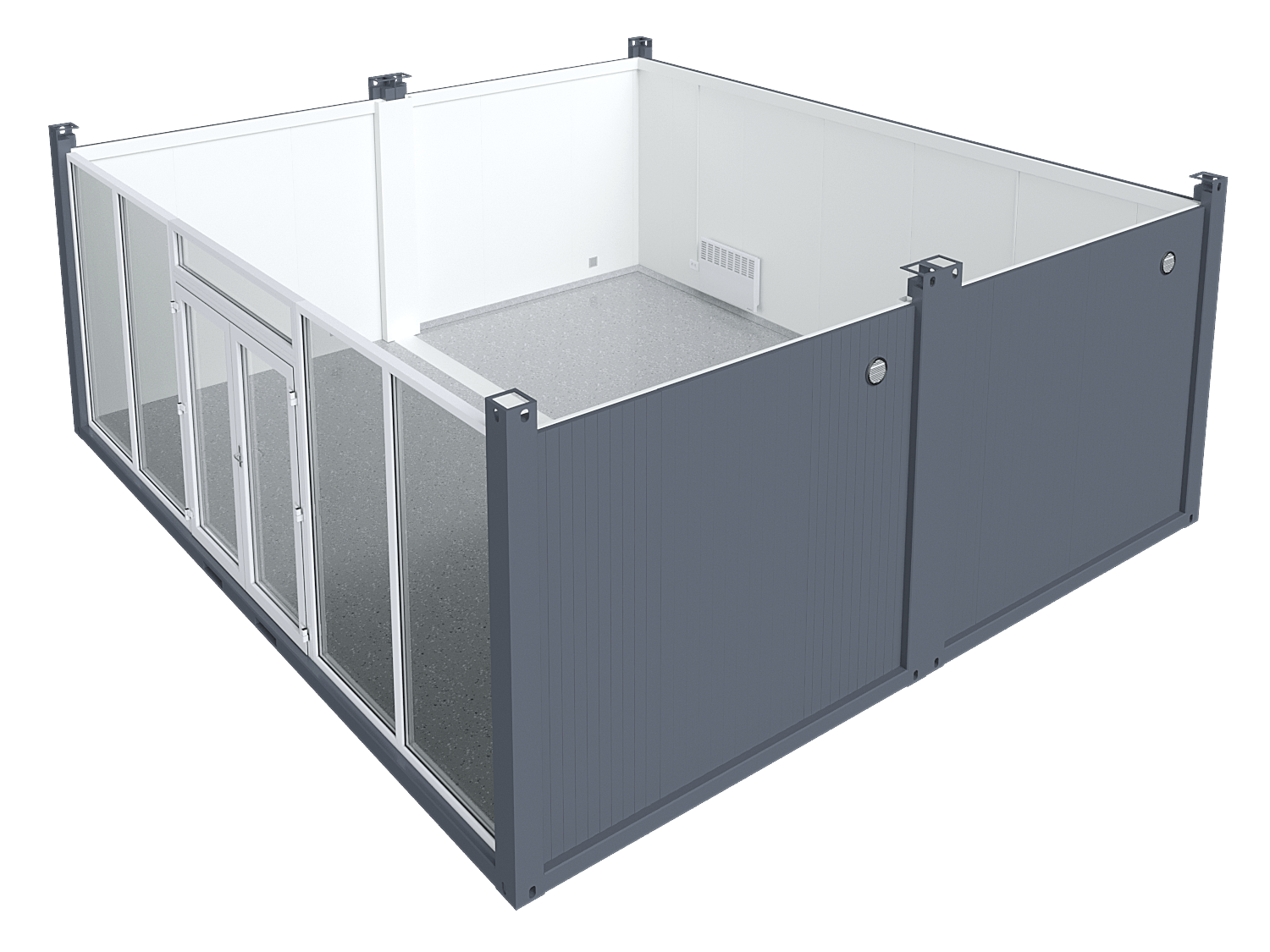 Eye-catching, high-quality, and bright ready-to-use container package! Two Premium class Office Containers are linked together so that the front container wall is of glass with glass double doors. Other walls enclosed. Choose from three different sizes. The standard accessories are the same in all of them. Air source heat pumps, access doors, heat recovery ventilation machine, and shelves as accessories. The enclosed walls, floor, and roof are thermally insulated for year-round use. Power supply, power sockets, 20 recessed LED lights, heating, and air conditioning come as standard equipment in the container. The Glass Container has a grey plastic floor, white window frames, and the exterior of the container is dark grey (RAL 7024) or light grey (RAL 7035). The inner material of the enclosed walls of the container is white sheet metal, which creates a bright interior and is easy to keep clean.